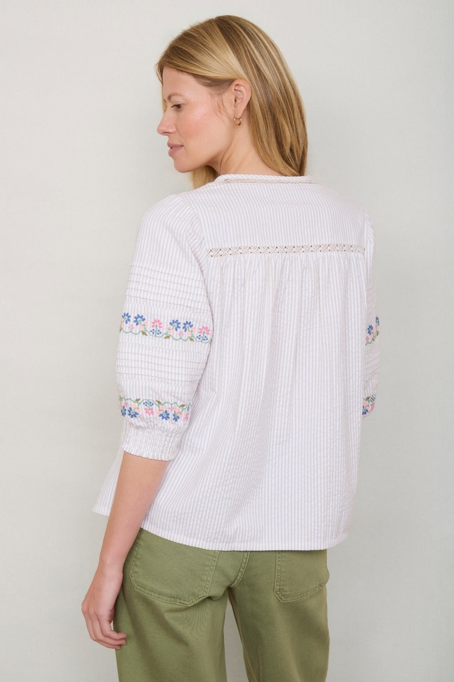 • Meet Deandra crafted in 100% cotton white and pale green stripe.
