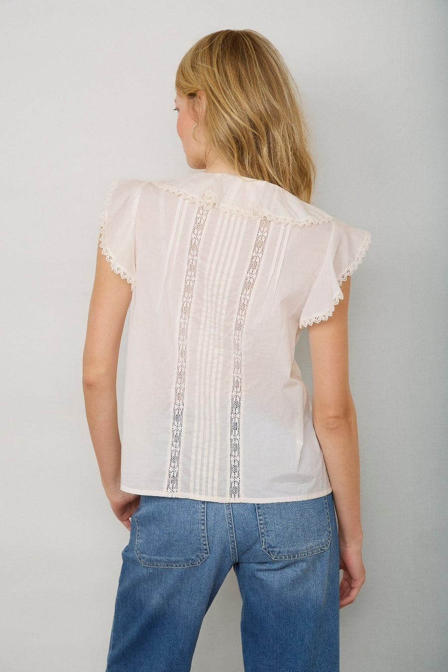 • Stylish feminine ruffle detail traces the neckline and runs down the placket.