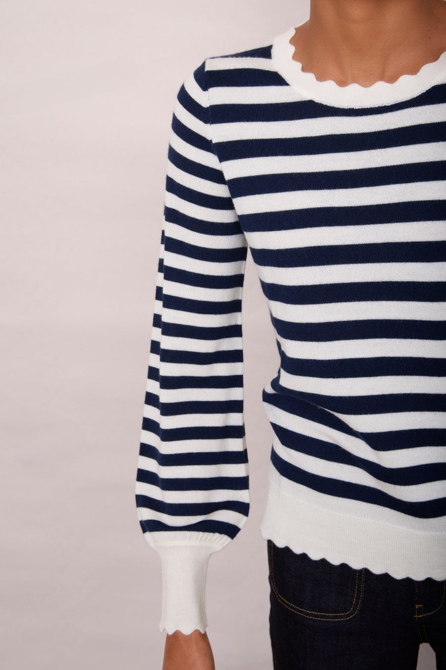 • Our best-selling Fleurine Scallop Jumper in a classic ecru and midnight stripe.
