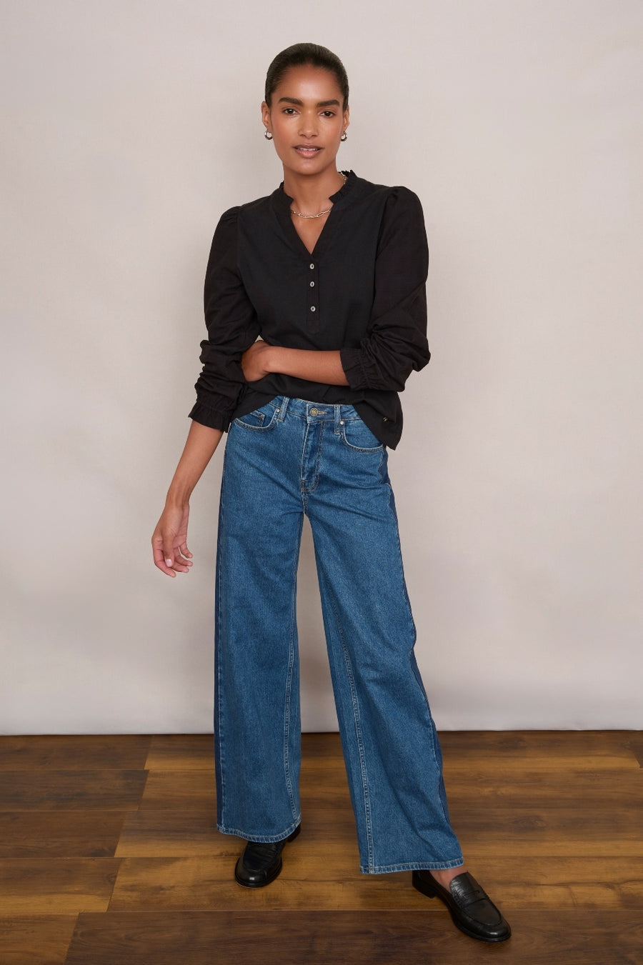 • A versatile jersey top with textured woven sleeves.