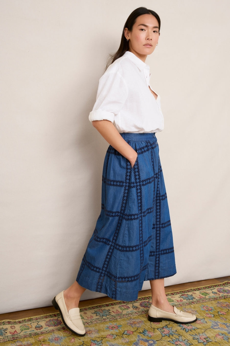 • Lovely light summer-weight denim with geometric broderie details, the Verity Skirt will be a favourite this summer.